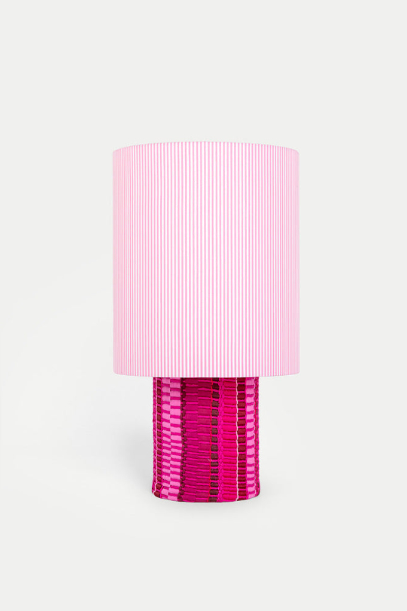 Con una base cubierta de tejido hecho en telar, combinando sedas, linos y diferentes texturas y una maxi pantalla de tejido de oxford de rayas rosas.