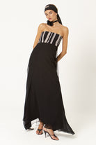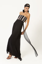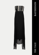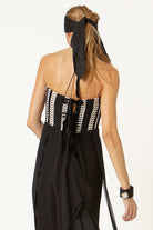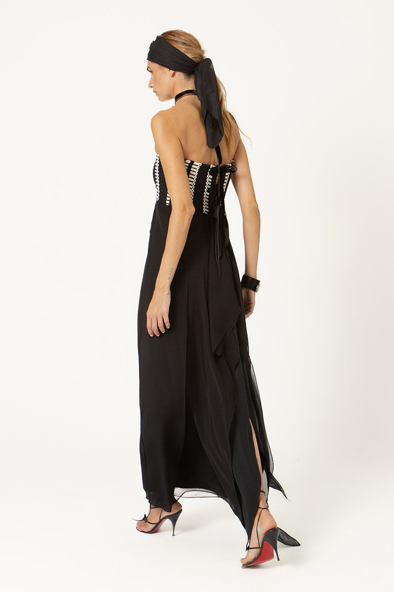 El vestido Helena, diseñado con nuestro tejido hecho en telar para toda la parte superior, jugando con las diferentes líneas y direcciones que genera este tejido único, acompañado de una espalda muy especial llena de diferentes cintas.