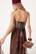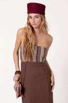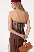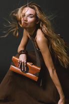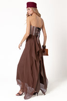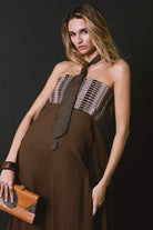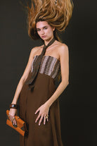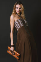 El vestido Helena, diseñado con nuestro tejido hecho en telar para toda la parte superior, jugando con las diferentes líneas y direcciones que genera este tejido único, acompañado de una espalda muy especial llena de diferentes cintas.