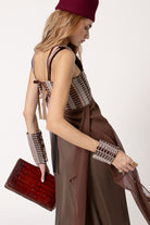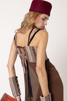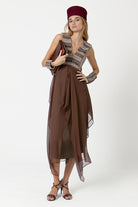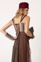 El icónico vestido V, diseñado con nuestro telar chocolate para toda la parte superior, jugando con las diferentes líneas y direcciones que genera este tejido único, acompañado de una espalda muy especial llena de diferentes cintas.