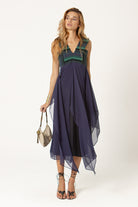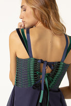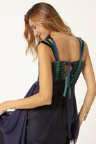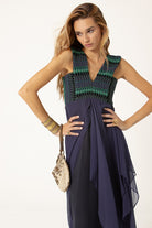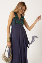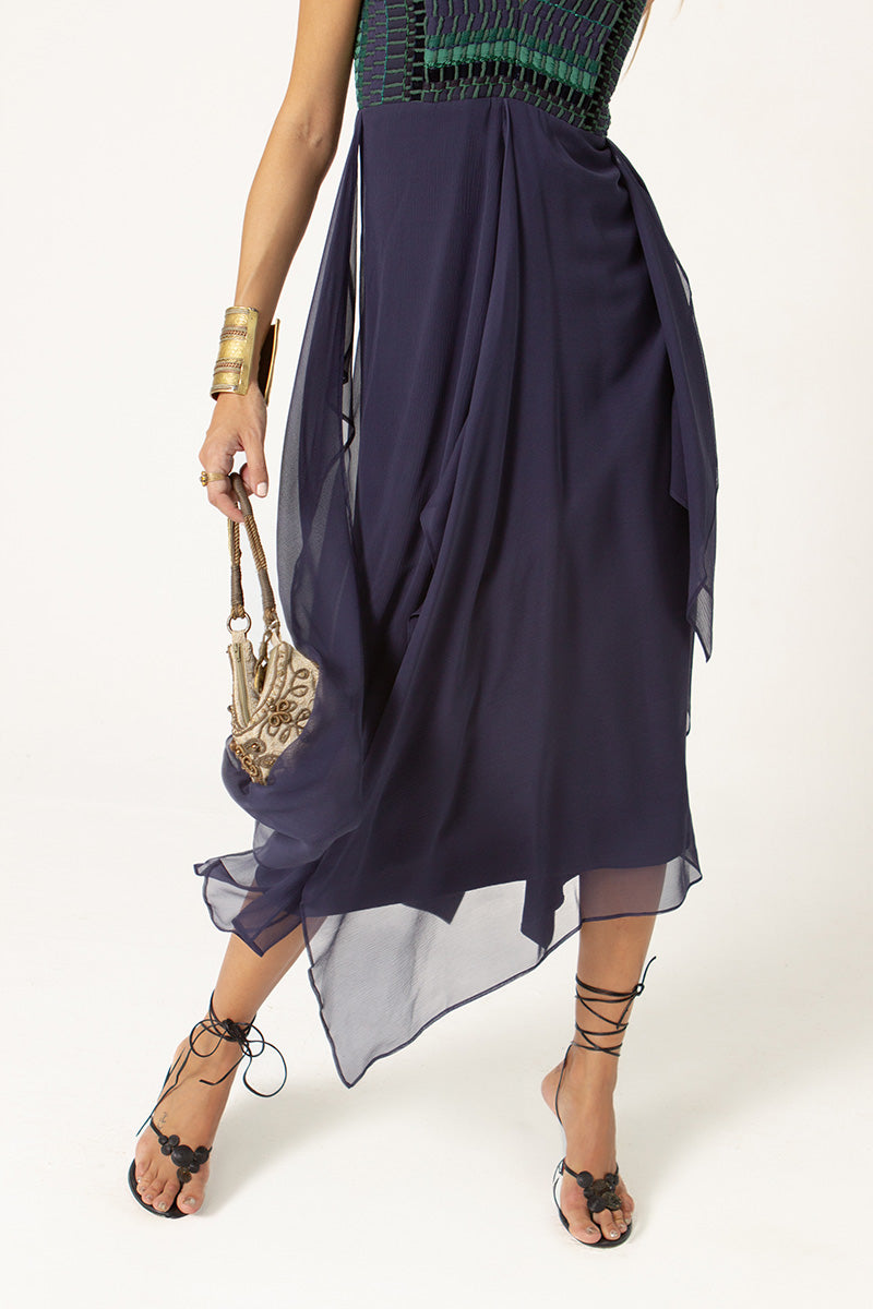 El icónico vestido V, diseñado con nuestro telar marino para toda la parte superior, jugando con las diferentes líneas y direcciones que genera este tejido único, acompañado de una espalda muy especial llena de diferentes cintas.