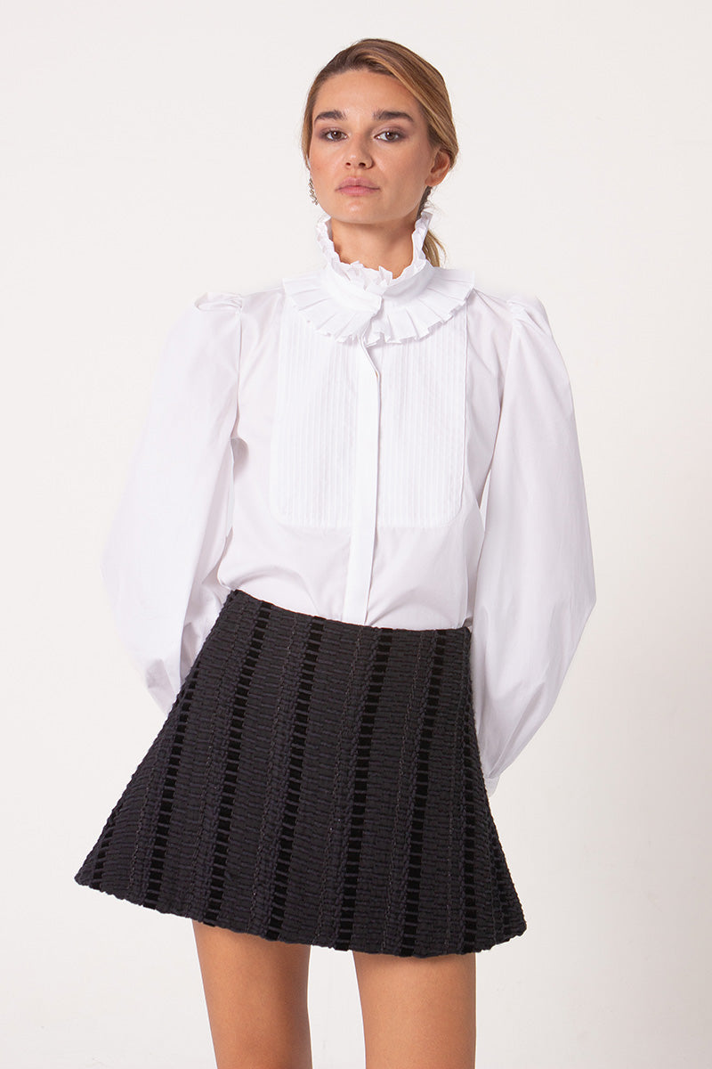 Esta camisa destaca también por sus amplias mangas y un cuello tipo ´gorguera´ muy trabajada gracias a sus infinitos pliegues tipo acordeón.