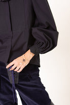 La Camisa Smoking, un diseño lleno de detalles inspirada en las clásicas camisas smoking de hombre. Mantenemos las jaretas en la pechera y las añadimos en sus puños acabados en pico como las corbatas.
