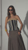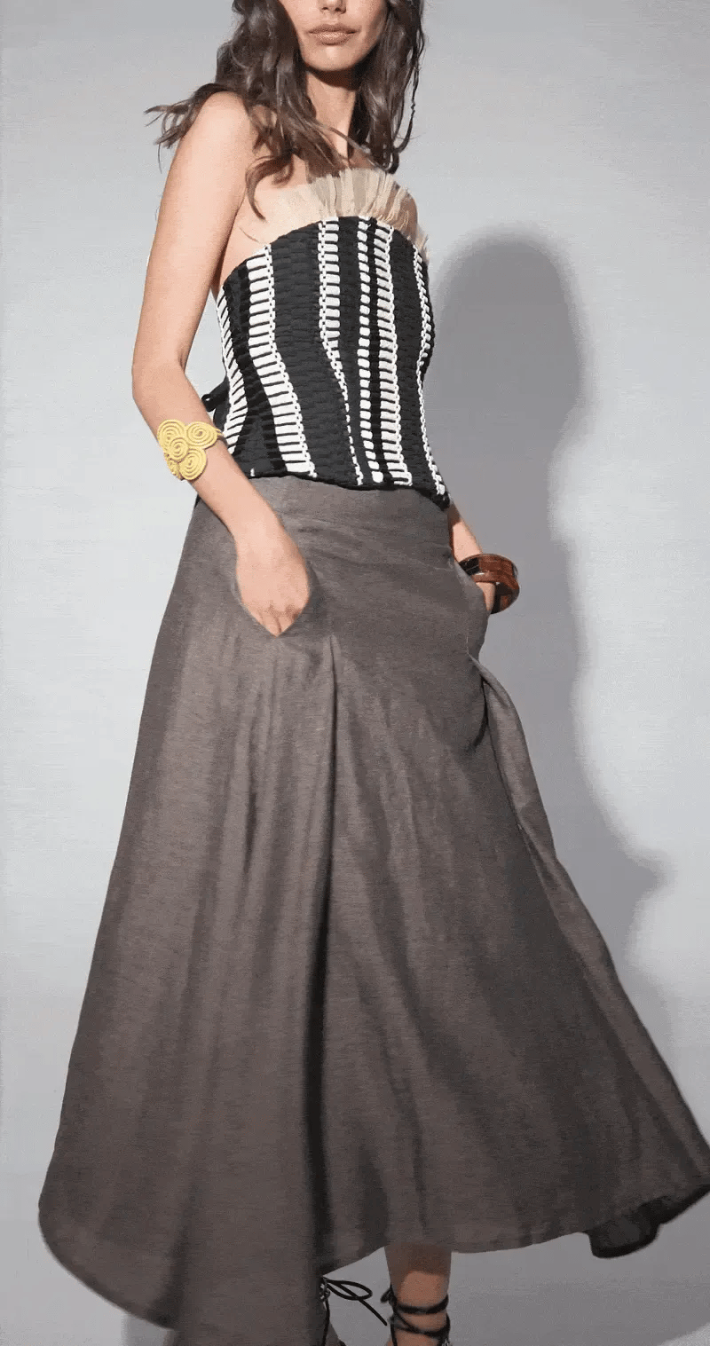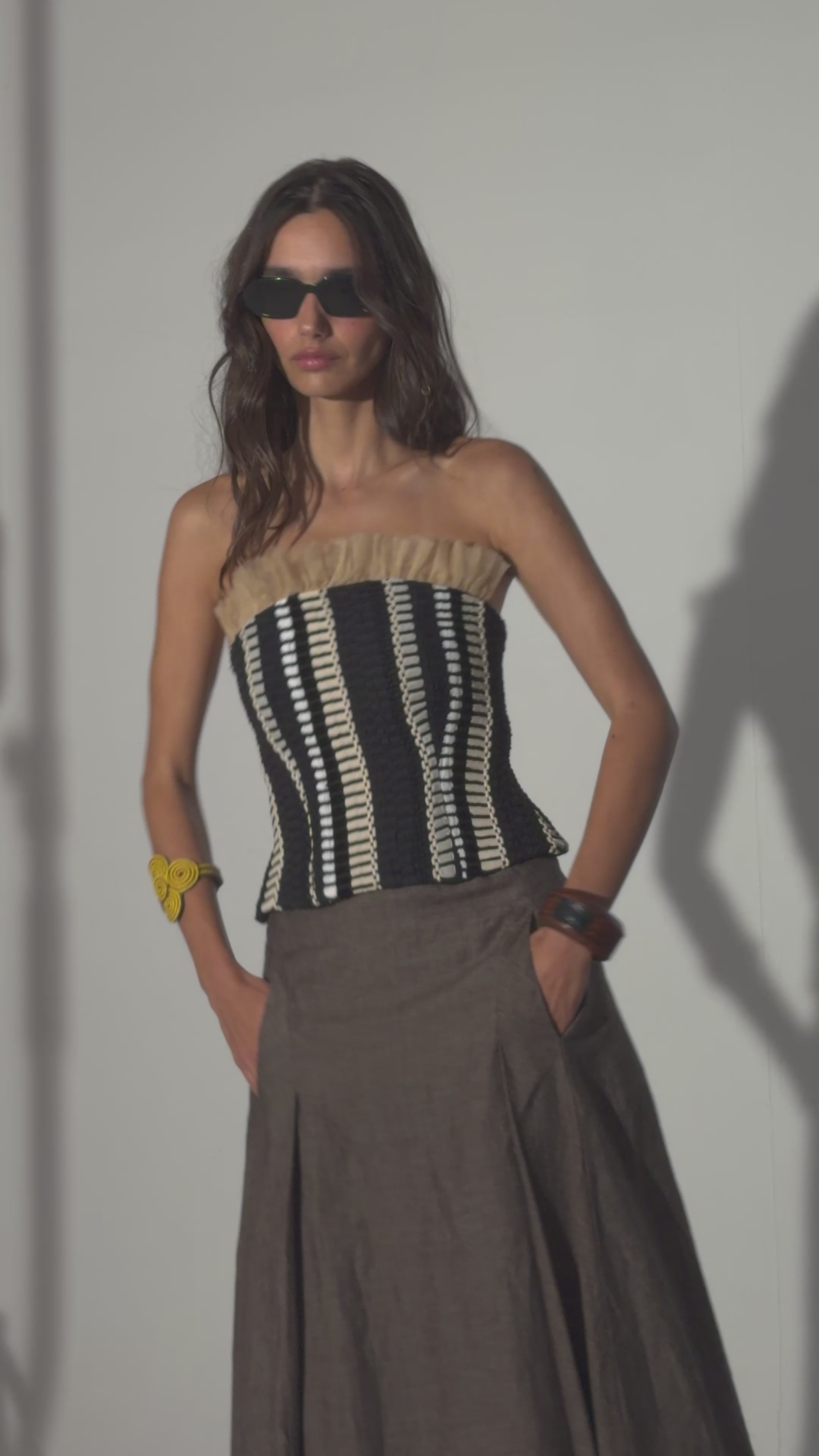 El top Clotilde en su versión más entallada, diseñado con nuestro telar blanco y negro para toda la parte superior, jugando con las diferentes líneas y direcciones que genera este tejido único.