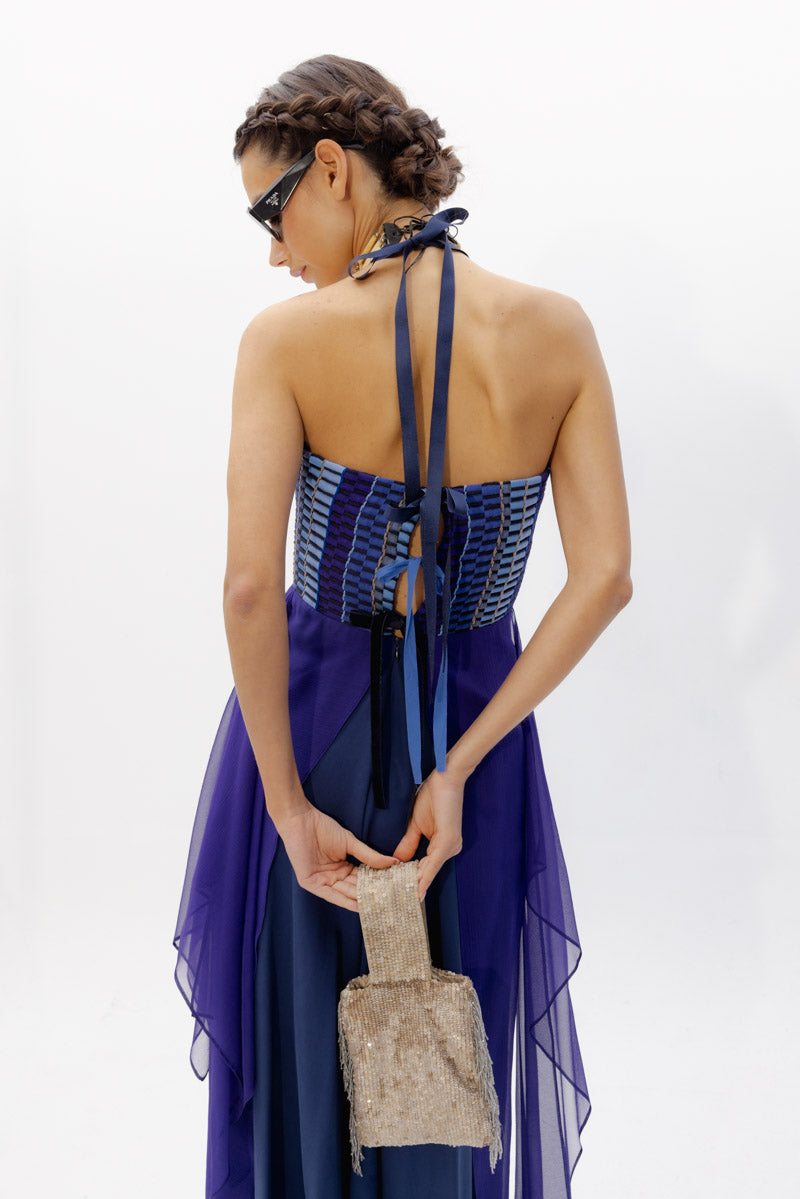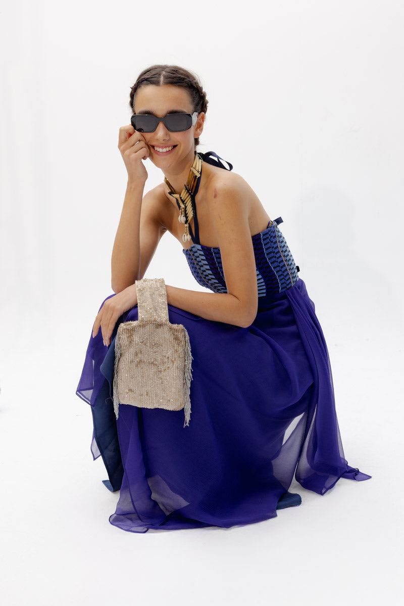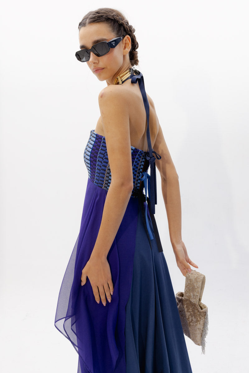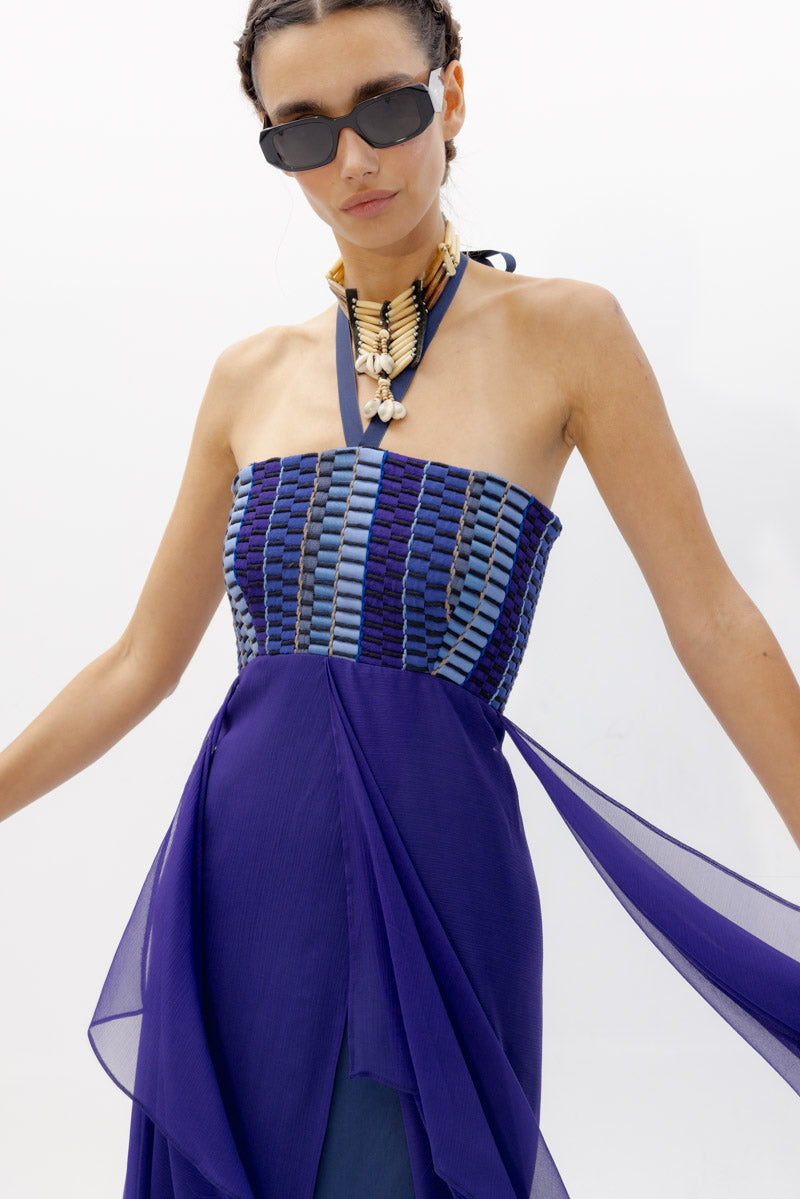 El Vestido Samba, diseñado con nuestro tejido hecho en telar para toda la parte superior en tonos azules, jugando con las diferentes líneas y direcciones que genera este tejido único.