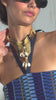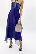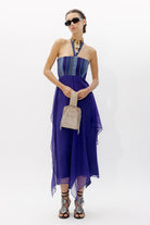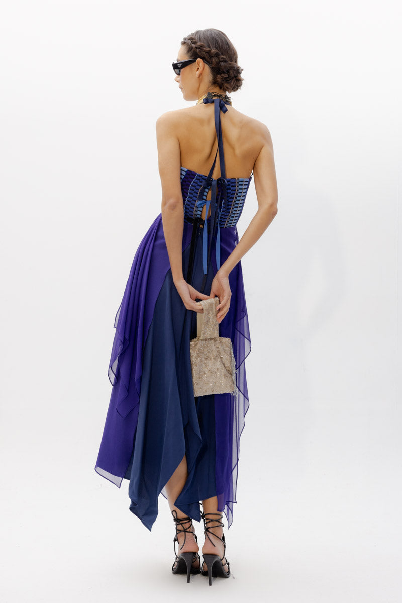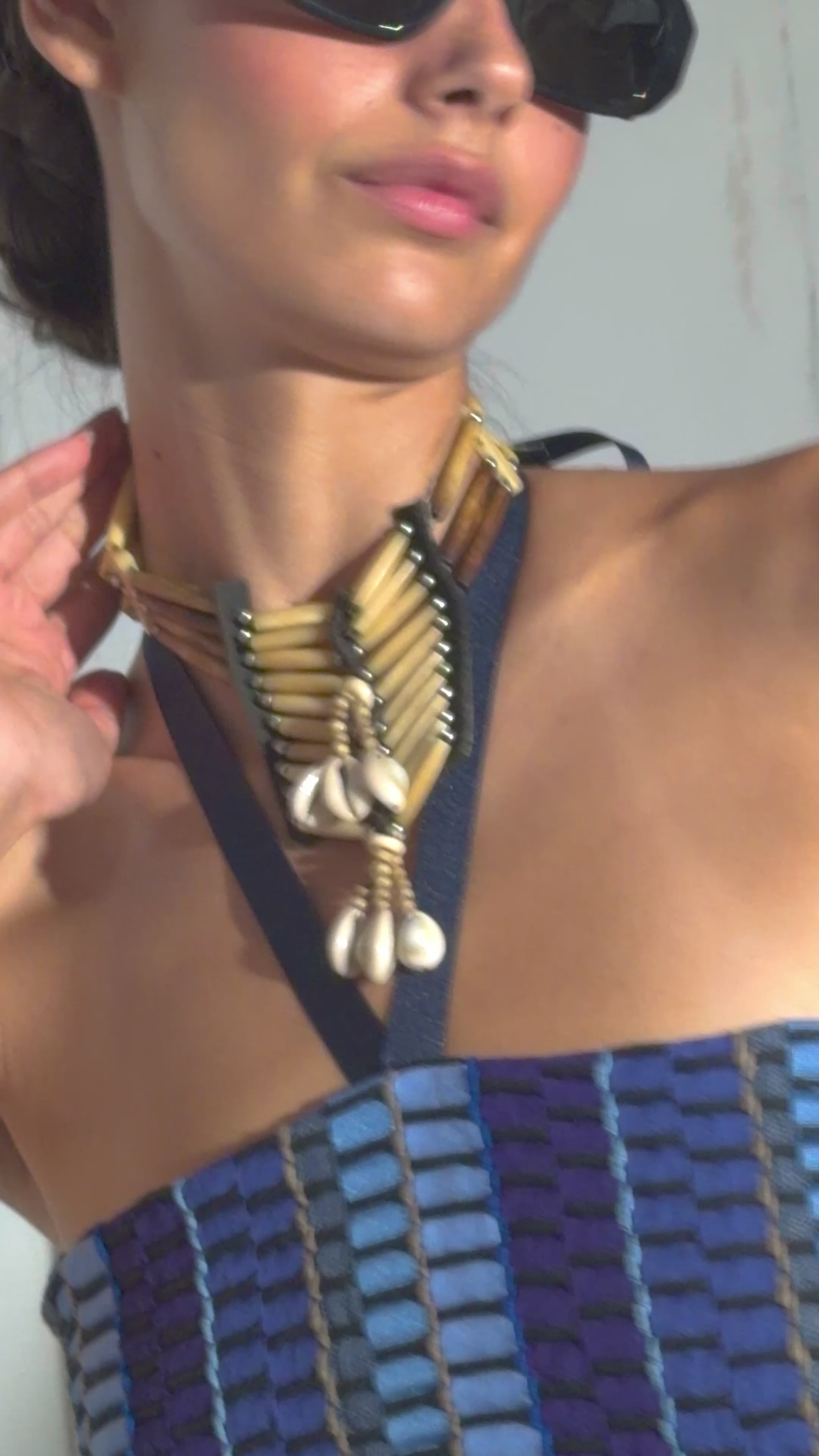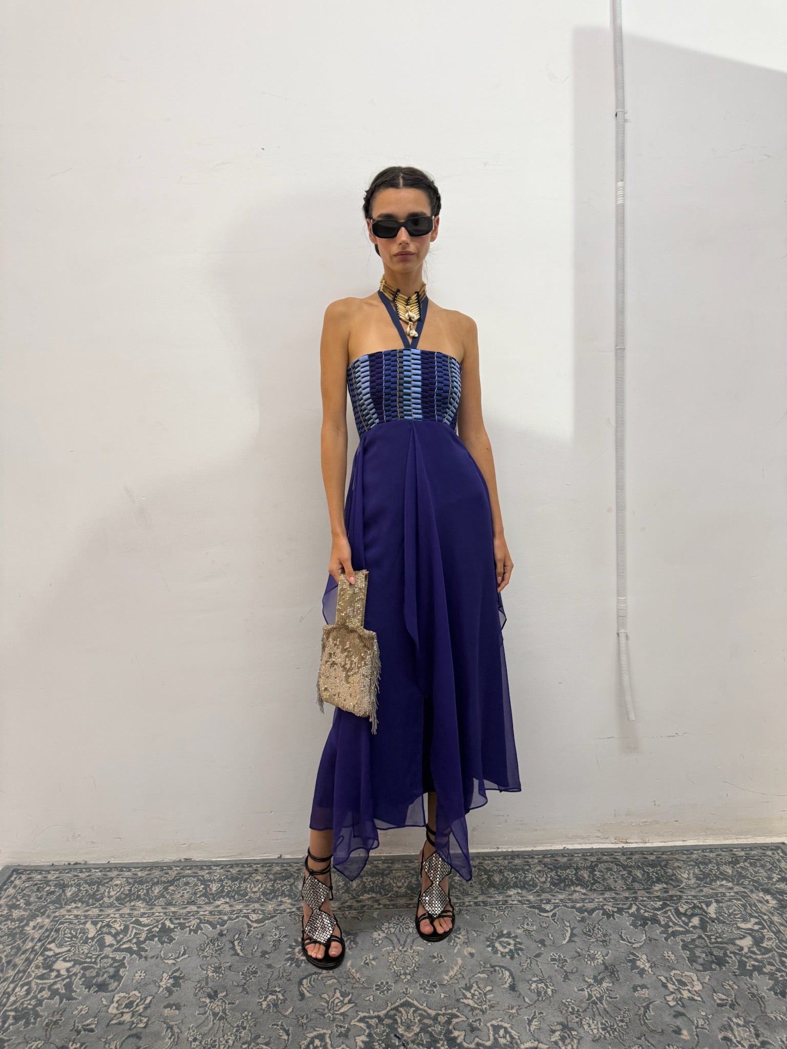 El Vestido Samba, diseñado con nuestro tejido hecho en telar para toda la parte superior en tonos azules, jugando con las diferentes líneas y direcciones que genera este tejido único.