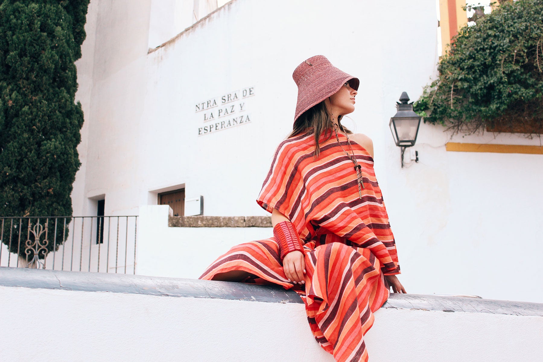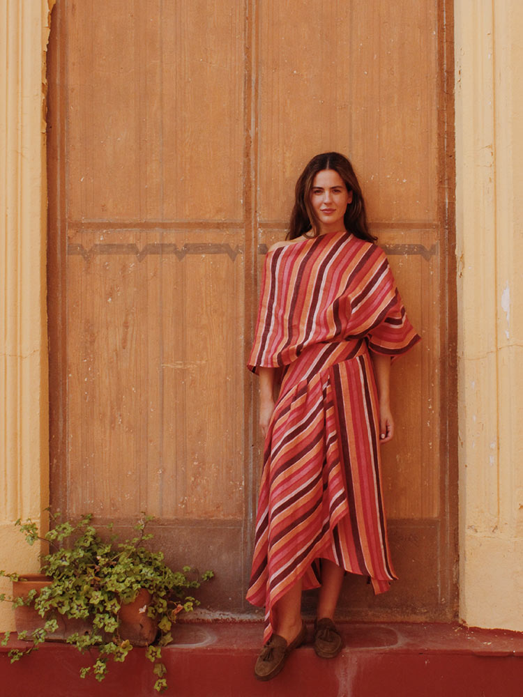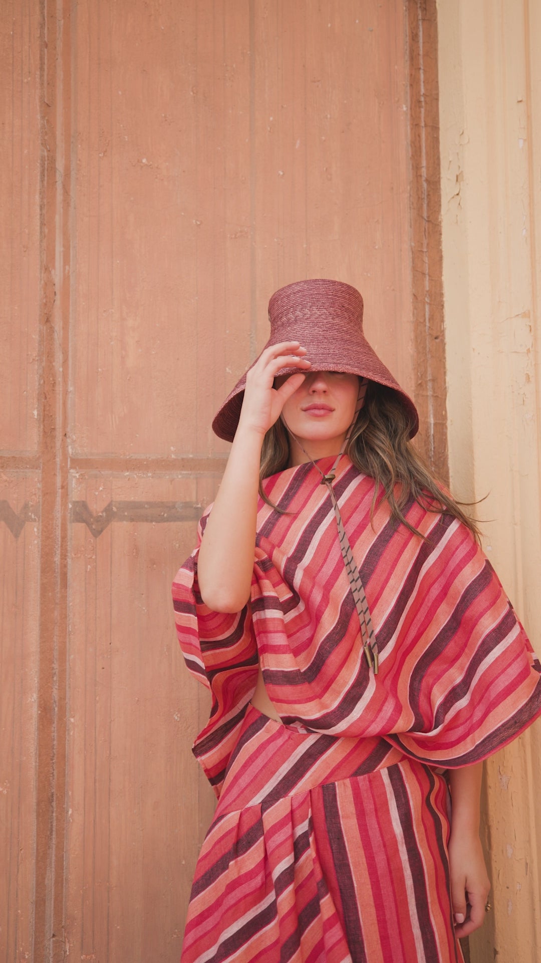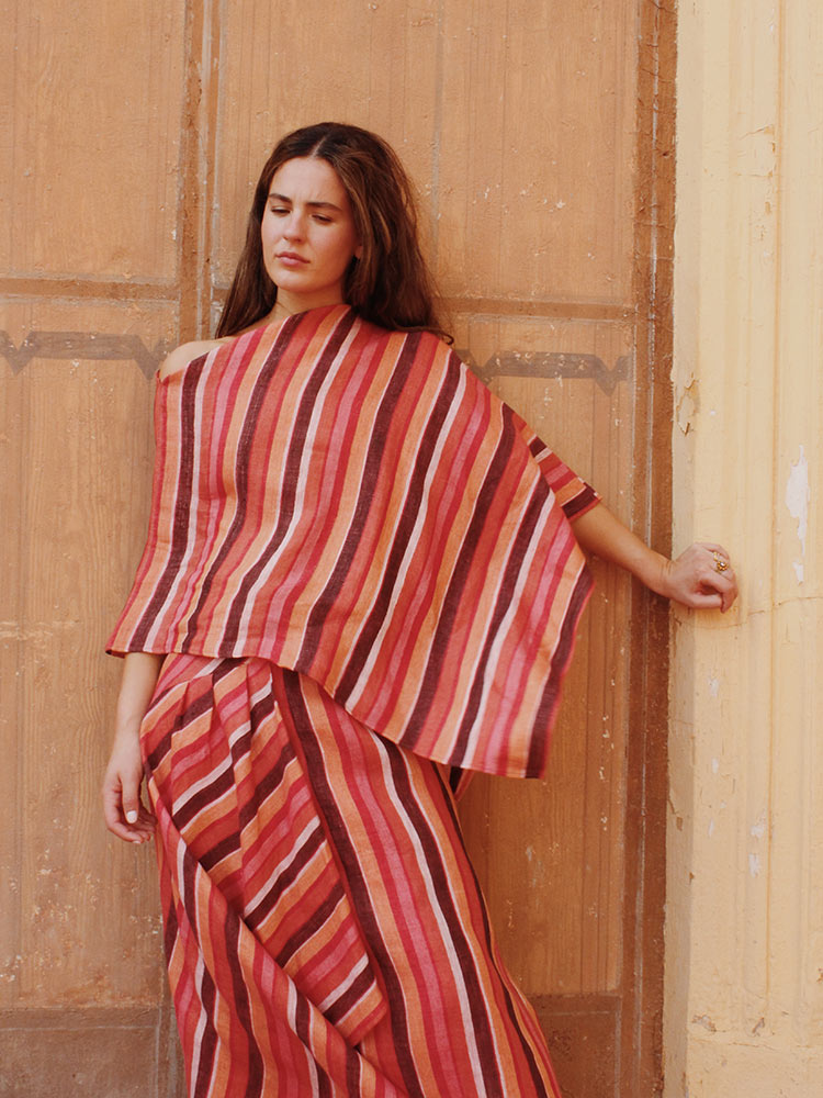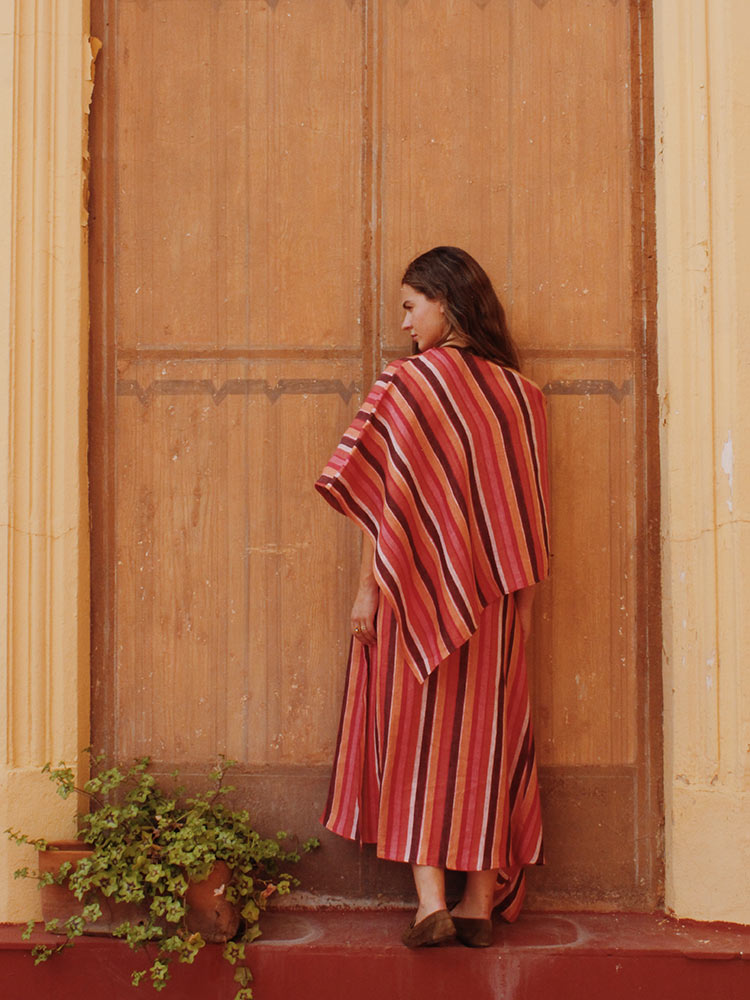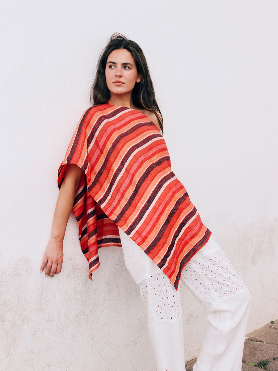 Nuestra Capa Ola Ola fucsia, diseñada en lino 100% con unas rayas y un colorido que animan cualquier look.
