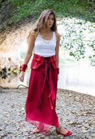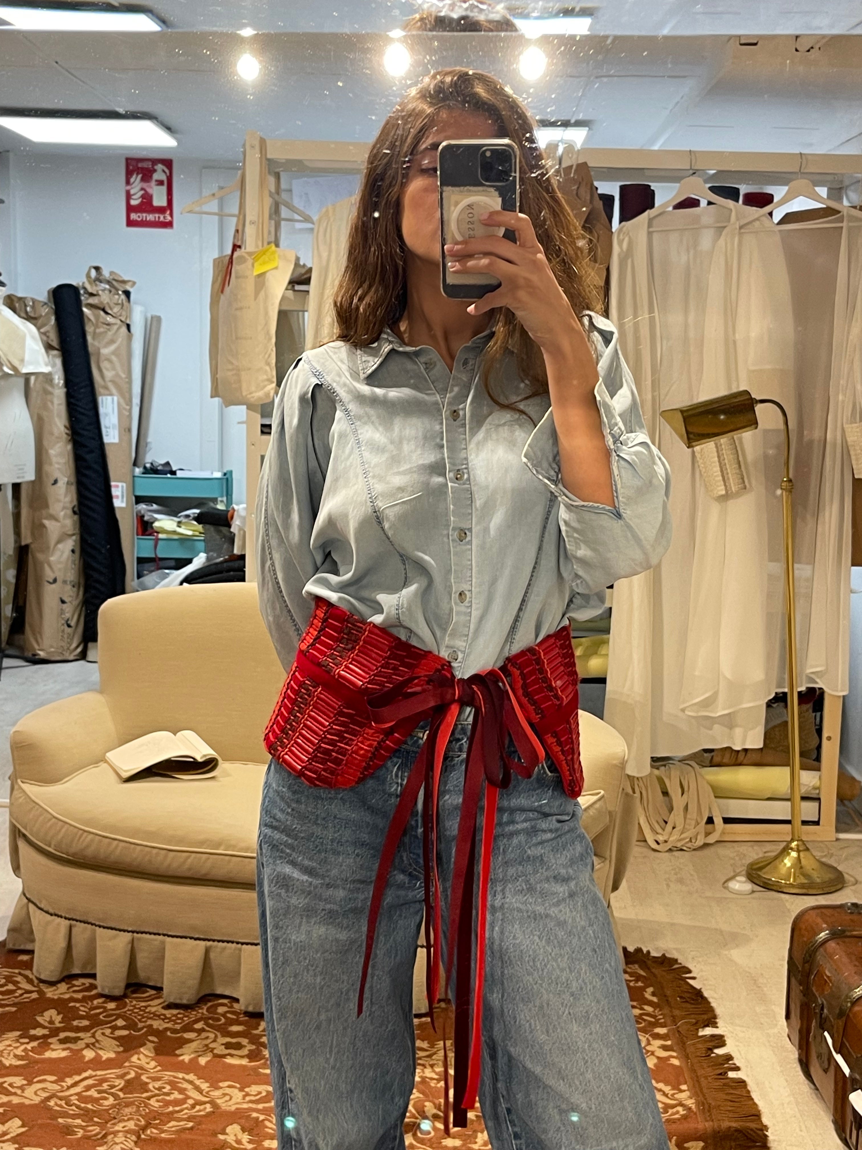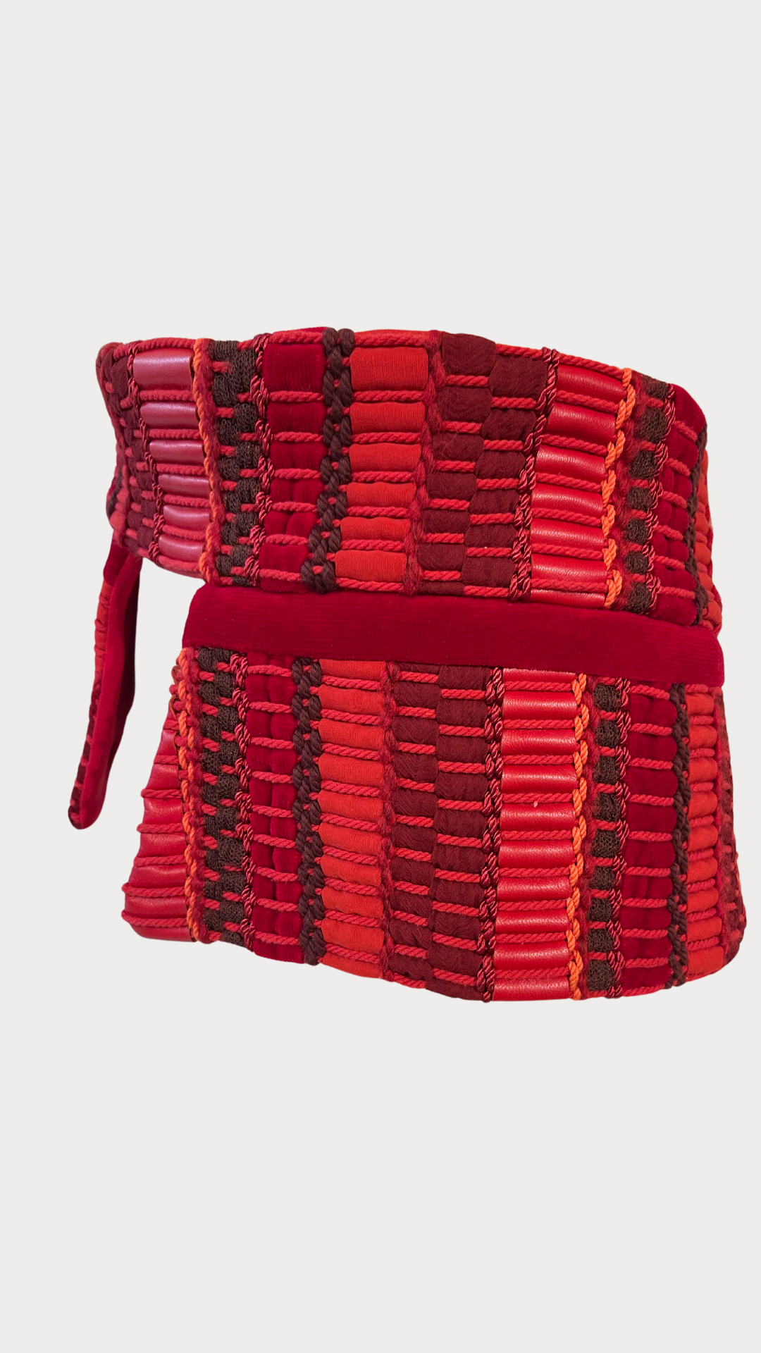 Nuestros icónico Magic Belt tejido en nuestro icónico telar en tonos rojos con una mezcla de piel, lana y sedas.