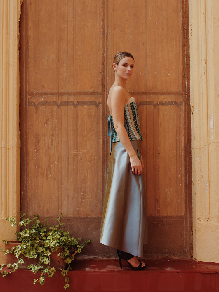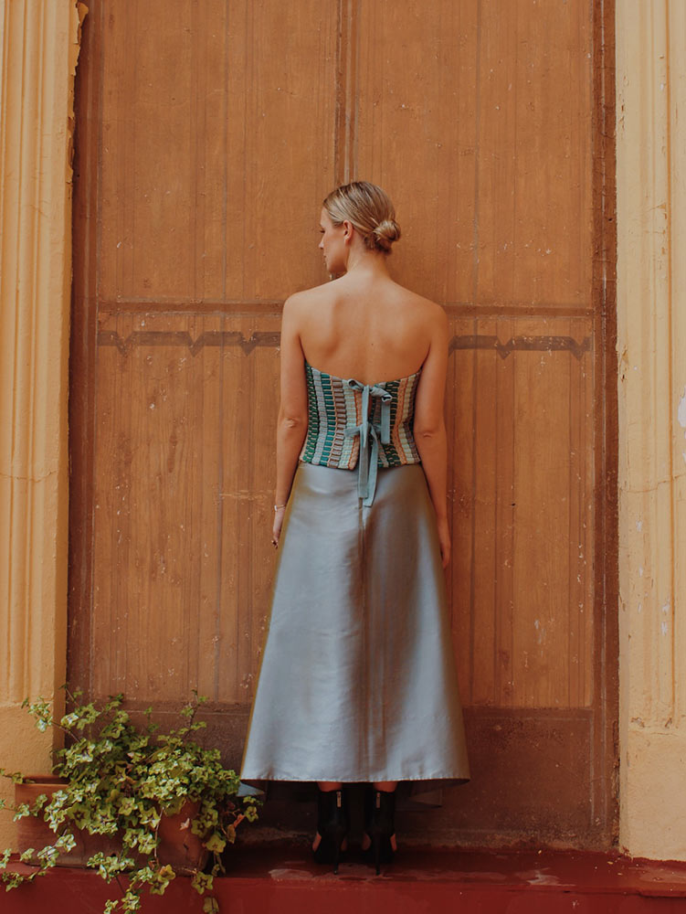 La Falda Parker, confeccionada en seda salvaje aguamarina, una pieza capaz de elevar cualquier look. El brillo y la delicadeza de la seda sobre unos pliegues estructurados dan lugar a esta falda tan especial.