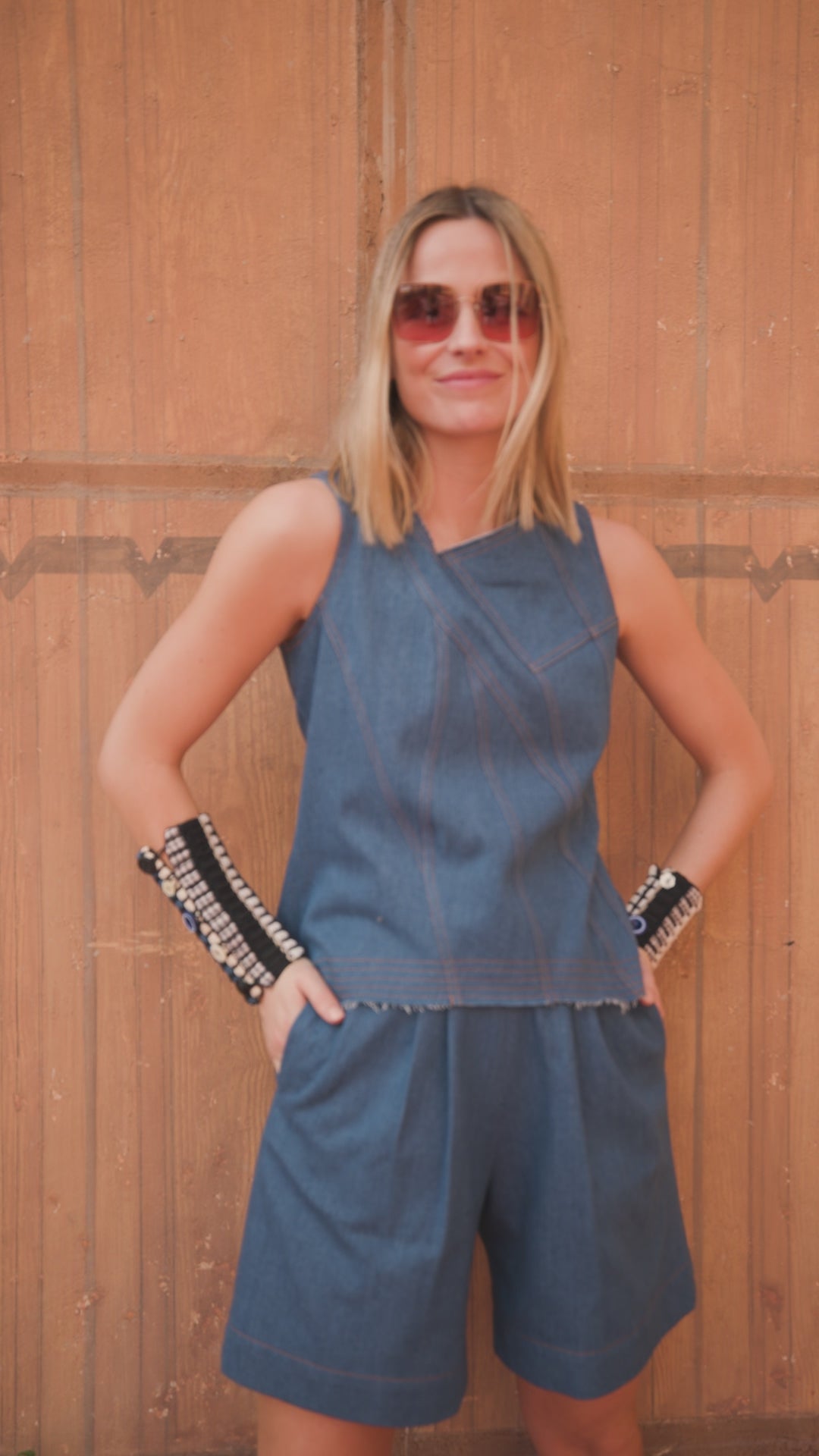 El Top Puzle, en tejido denim y pespuntes en oro viejo.