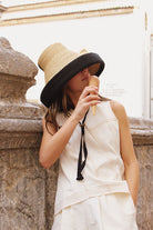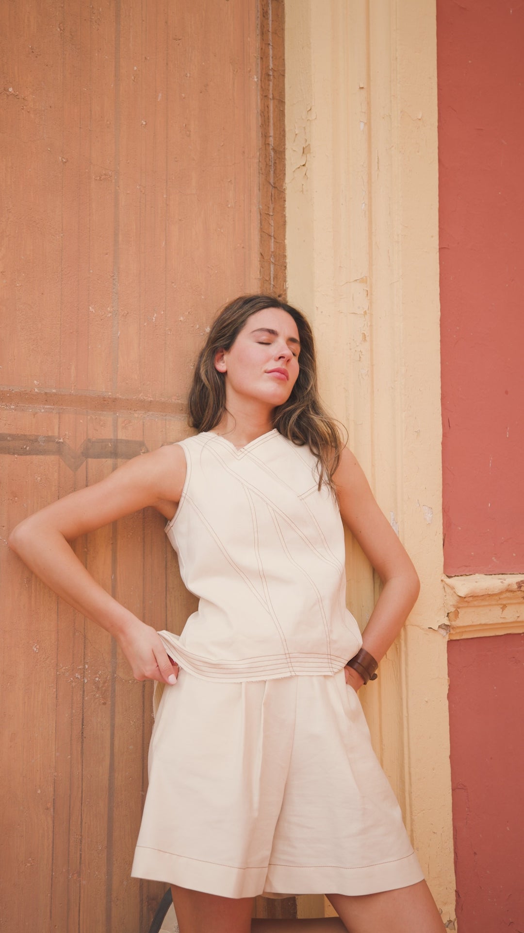El Top Puzle, en tejido de algodón color hueso y pespuntes en oro viejo.