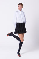 Esta camisa destaca también por sus amplias mangas y un cuello tipo ´gorguera´ muy trabajada gracias a sus infinitos pliegues tipo acordeón.