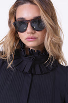 Esta camisa destaca también por sus amplias mangas y un cuello tipo ´gorguera´ muy trabajada gracias a sus infinitos pliegues tipo acordeón.