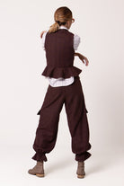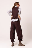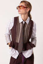 El Chaleco Mamounia, diseñado en tejido de cuadros en lana y nuestro telar chocolate que dibuja la pechera tan particular de esta prenda.