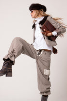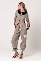 Una chaqueta de fondo de armario llena de detalles: puños con nuestro tejido hecho en telar acompañado de la suavidad y brillo tan característico del terciopelo de algodón.