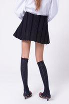 Nuestra mini falda negra soñada, con un corte tipo ´A `, y nuestro tejido hecho en telar combinando distintas texturas como seda, terciopelo o tul.