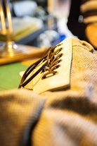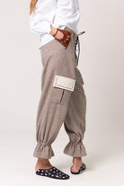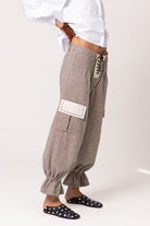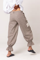 Nuestro Pantalón Medusa, confeccionado en espiga de lana beige acompañado de apliques de piel tanto en el detalle frontal como en bolsillos.