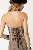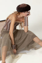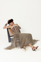 Nuestro icónico Top Clotilde en su versión más entallada, diseñado con nuestro telar en tonos marrones y champagne para toda la parte superior, jugando con las diferentes líneas y direcciones que genera este tejido único. Cintas de tencel en la espalda que cierran esta pieza y organza de seda plisada de un color tomado en el escote.