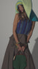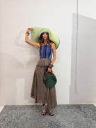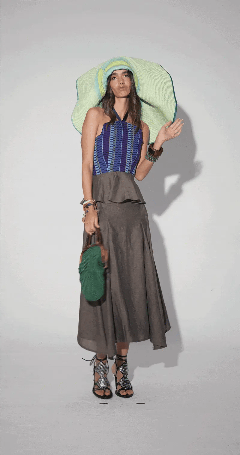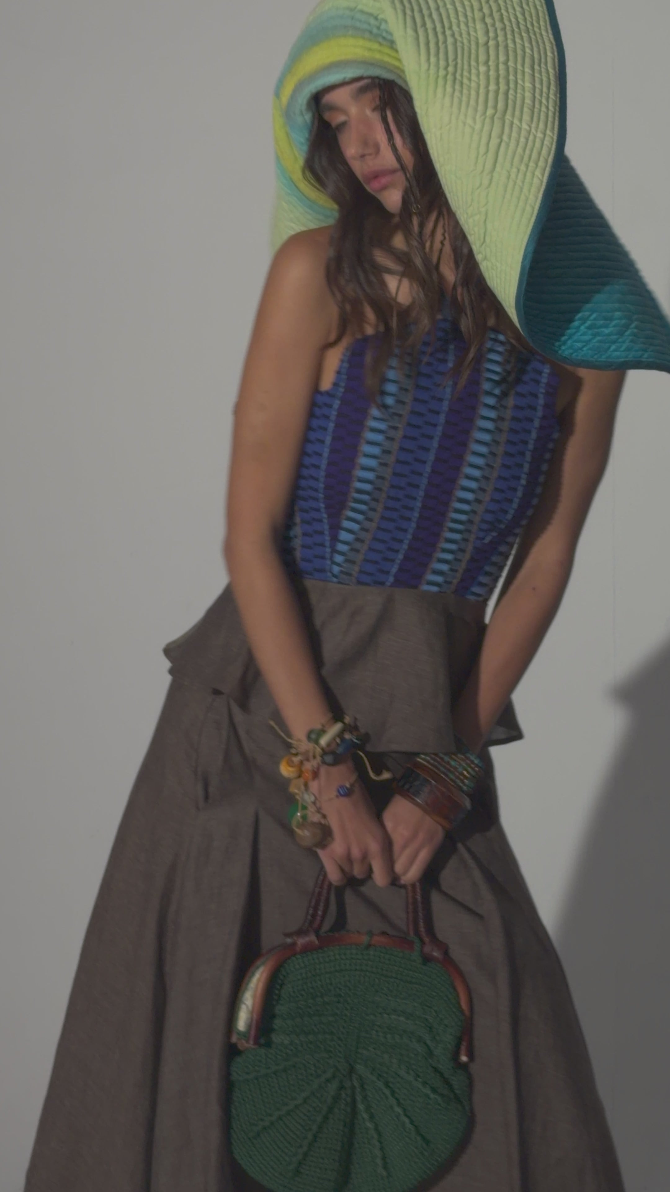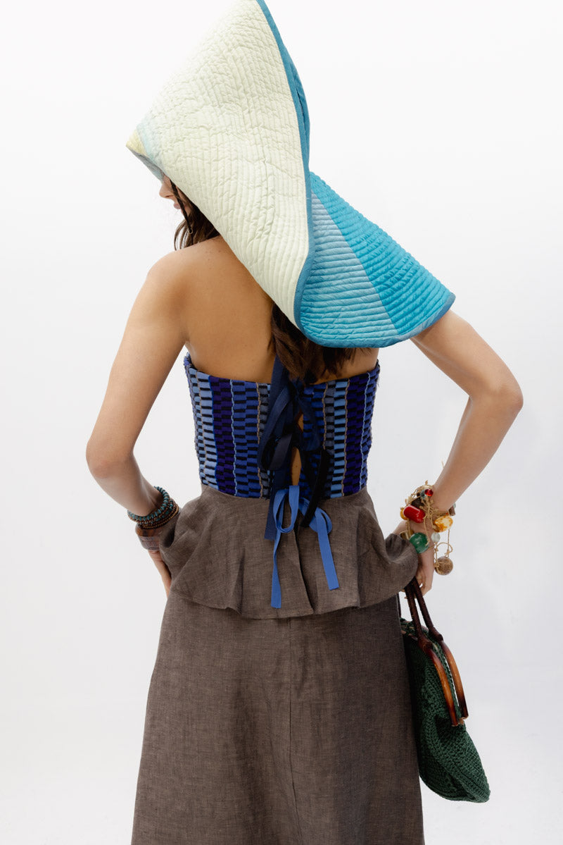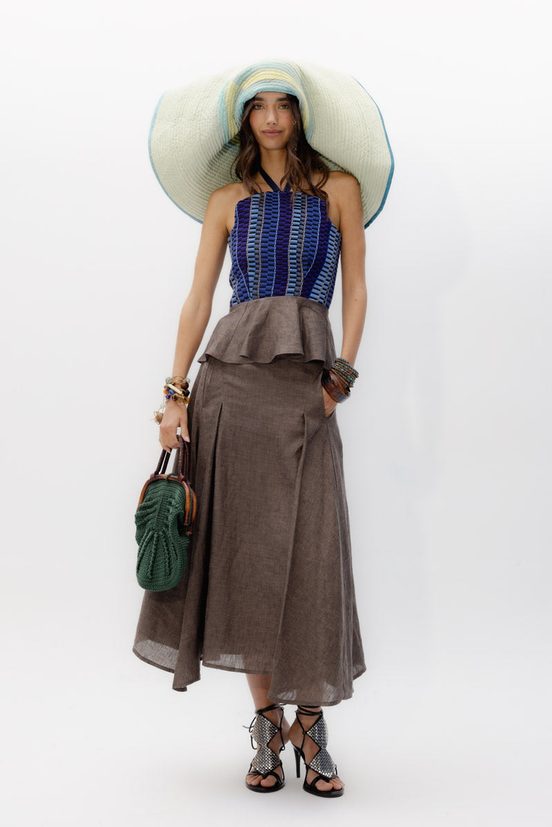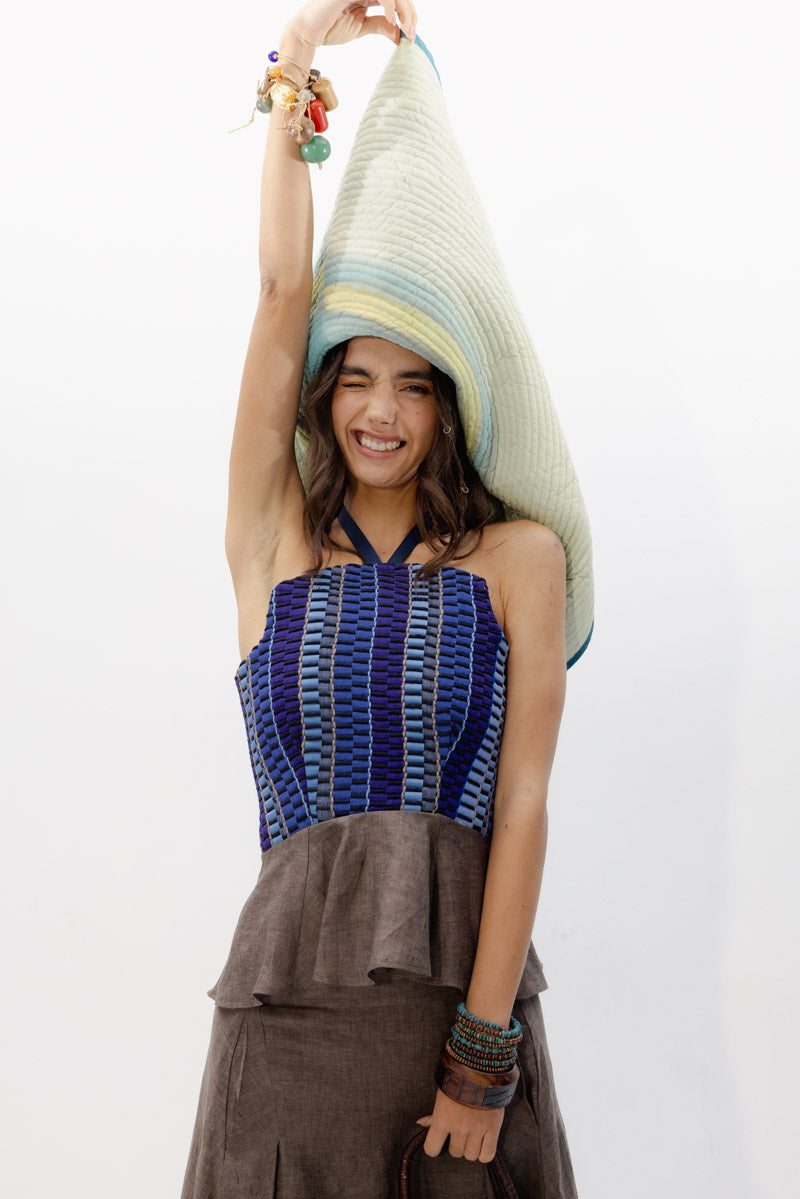 El Top Eulalia, diseñado con nuestro tejido hecho en telar para toda la parte superior en tonos azules, jugando con las diferentes líneas y direcciones que genera este tejido único, acompañado de un volante en lino color tabaco para la parte inferior.