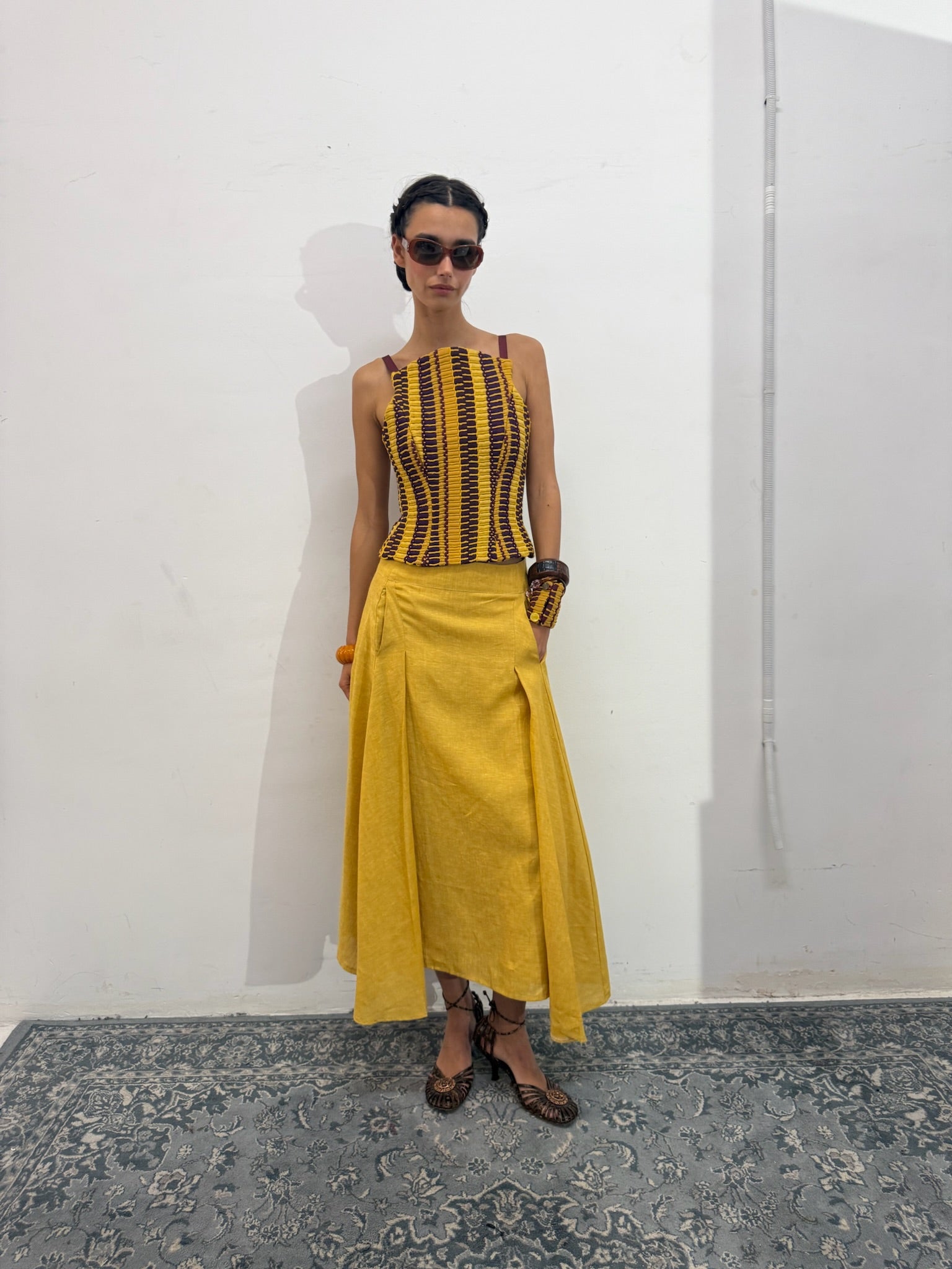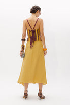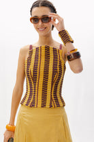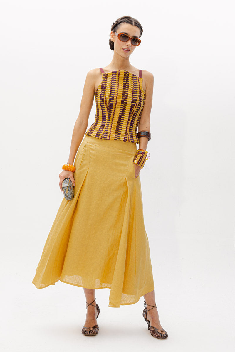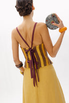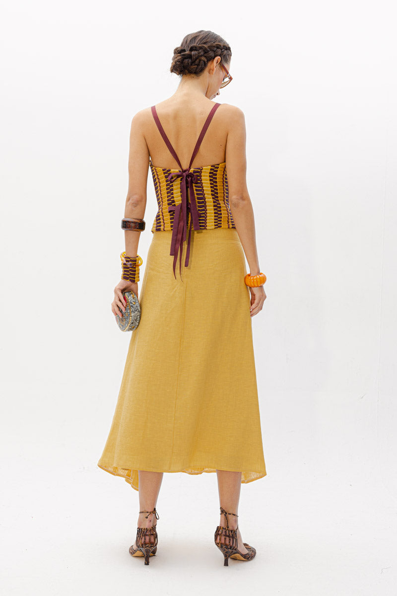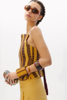 El Top Ipanema, una pieza diseñada con nuestro tejido hecho en telar en diferentes tonalidades mostaza y berenjena, con texturas como lino, tul o seda ; jugando con las diferentes líneas y direcciones que genera este tejido único.