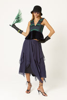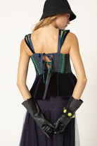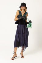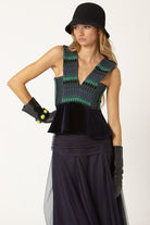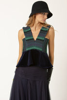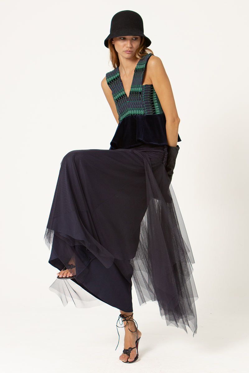 El Top V, diseñado con nuestro telar marino para toda la parte superior, jugando con las diferentes líneas y direcciones que genera este tejido único, acompañado de un volante en terciopelo de algodón para la parte inferior.