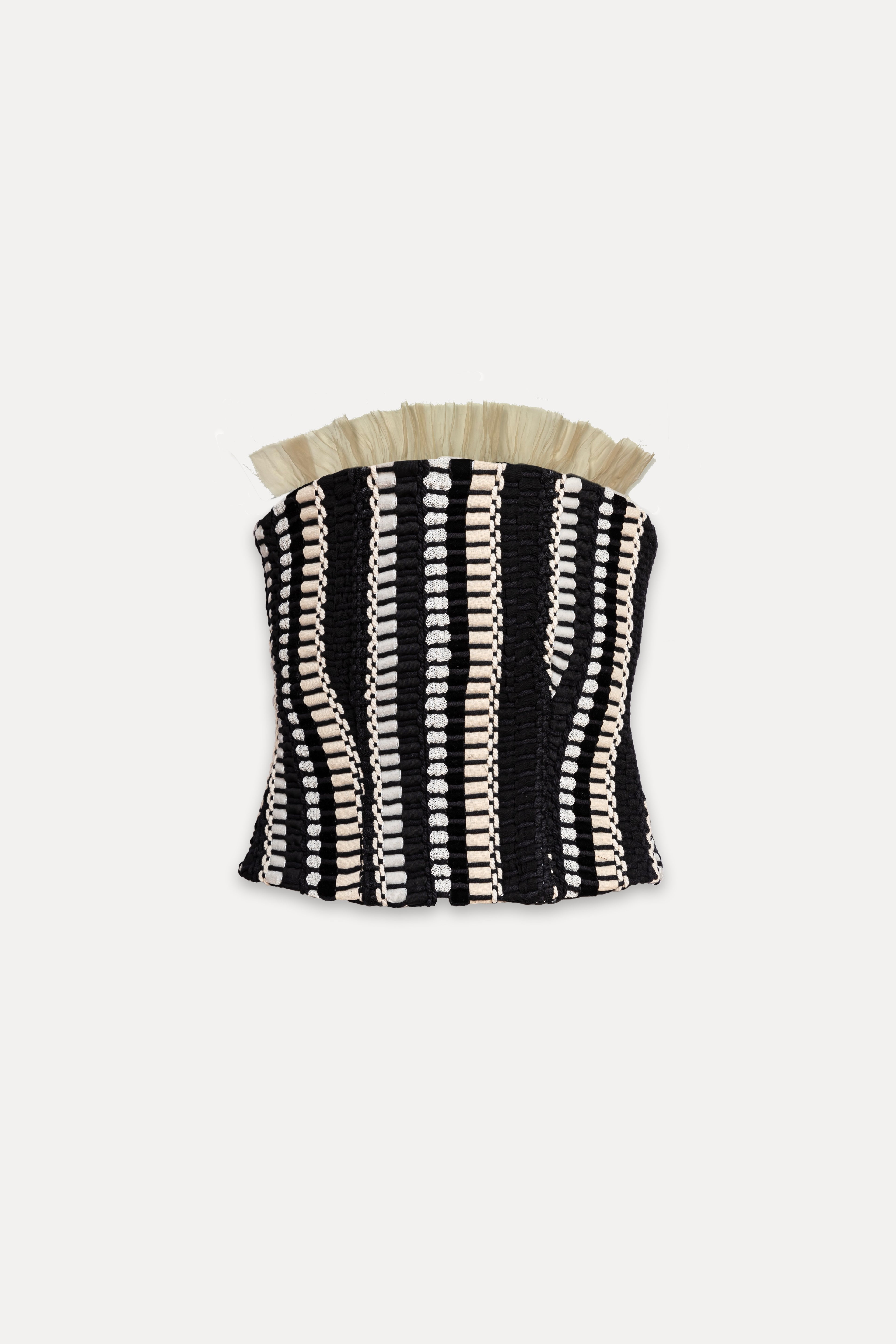 The Clotilde top, in its most fitted version, designed with our black and white loom for the entire upper part, playing with the different lines and directions generated by this unique fabric. Tencel ribbons on the back close this piece, and pleated organza in a rich color at the neckline.