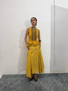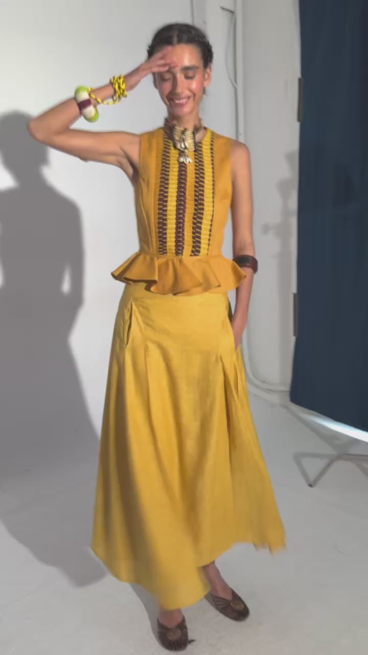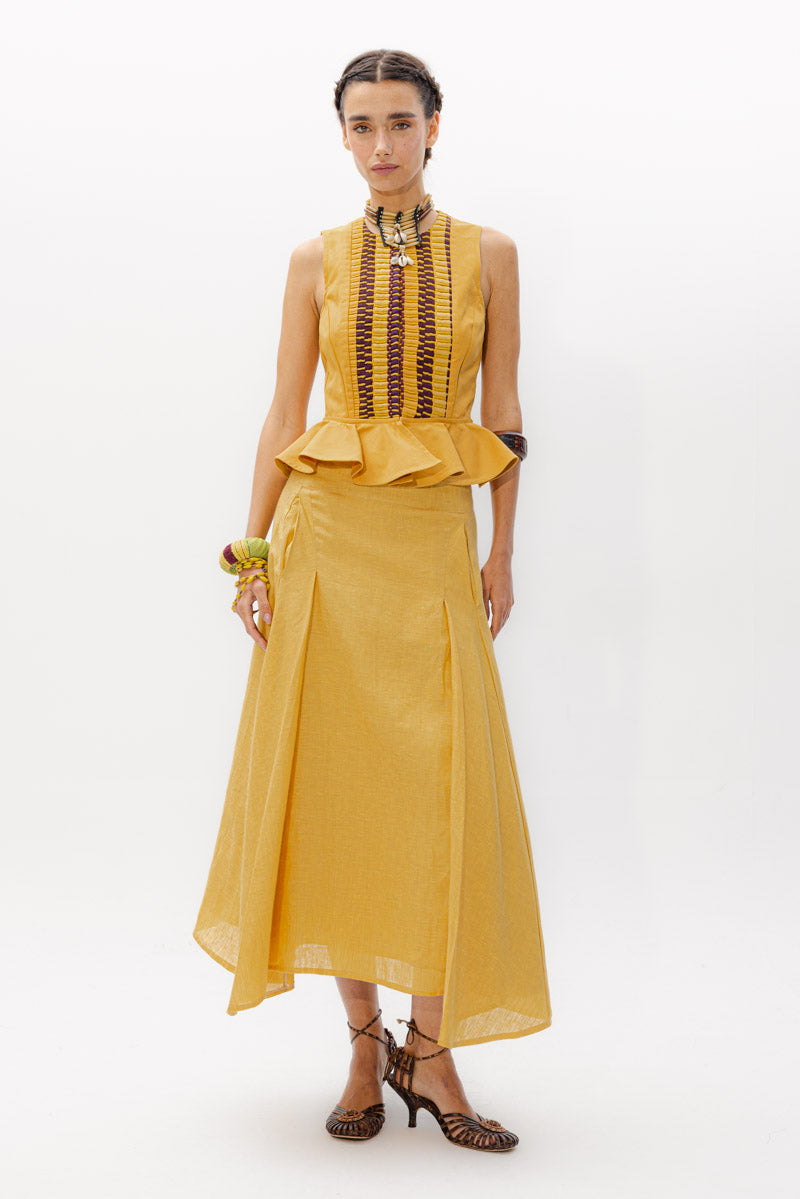 Su tejido de algodón de gran estructura hace que se adapte perfectamente al cuerpo además del volumen tan especial que crea en el volante de esta pieza.