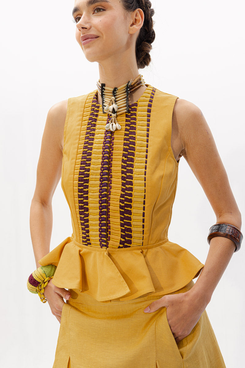 El Chaleco Mamounia, diseñado en tejido de algodón y nuestro tejido en hecho en telar que dibuja la pechera tan particular de esta prenda.
