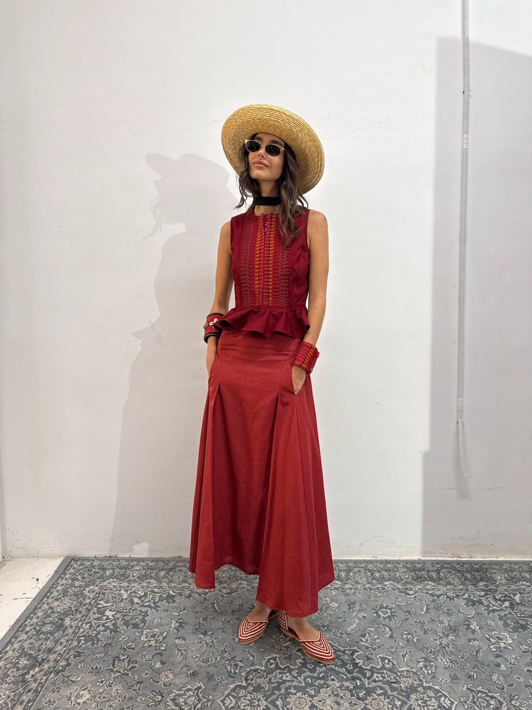 El Chaleco Mamounia, diseñado en tejido de algodón y nuestro tejido en hecho en telar que dibuja la pechera tan particular de esta prenda.