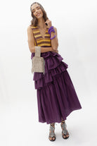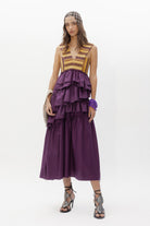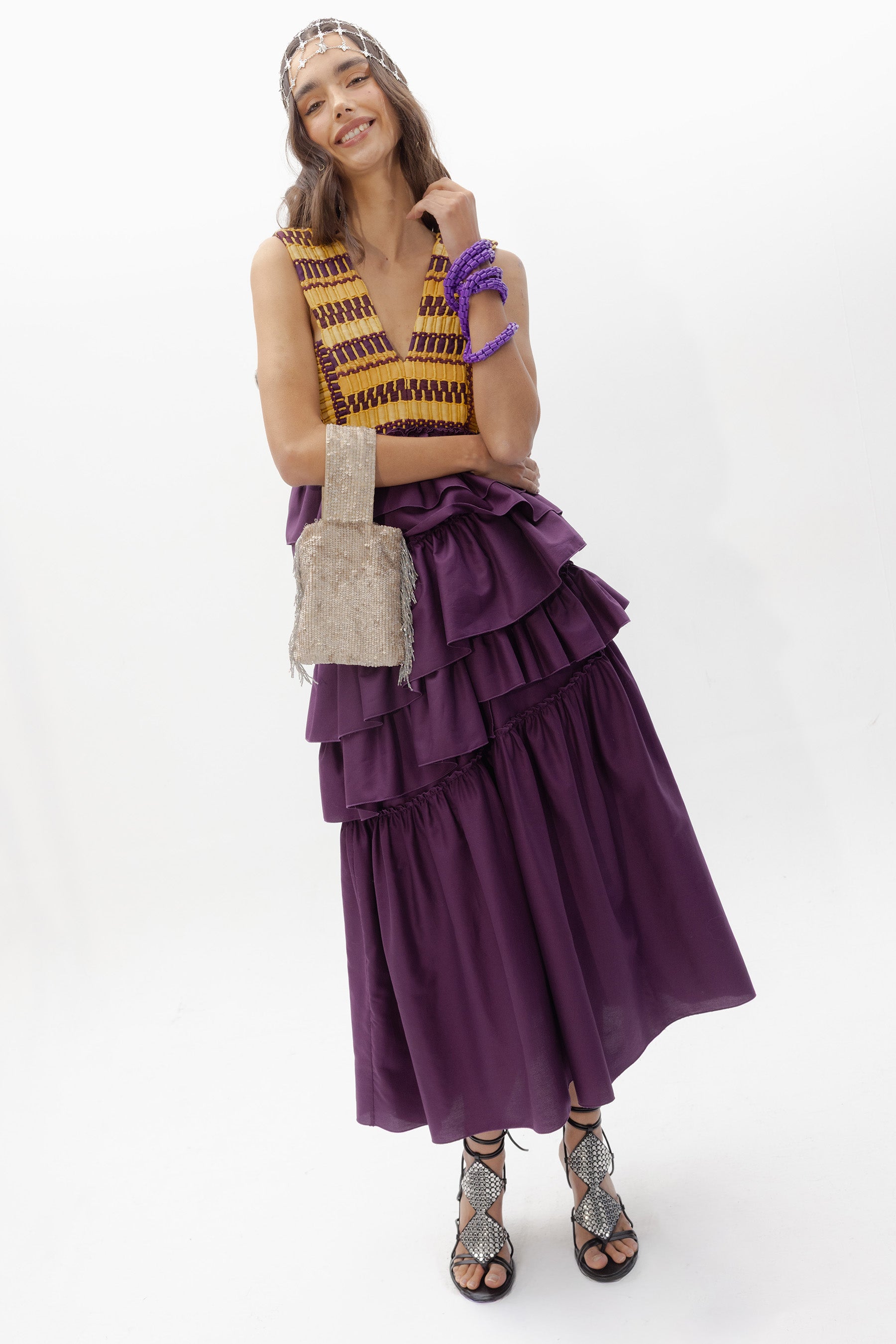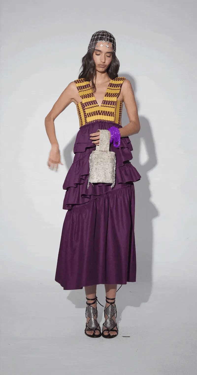La parte inferior de esta pieza es un juego de volantes asimétricos que dan movimiento y personalidad a esta prenda.