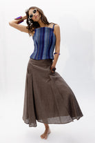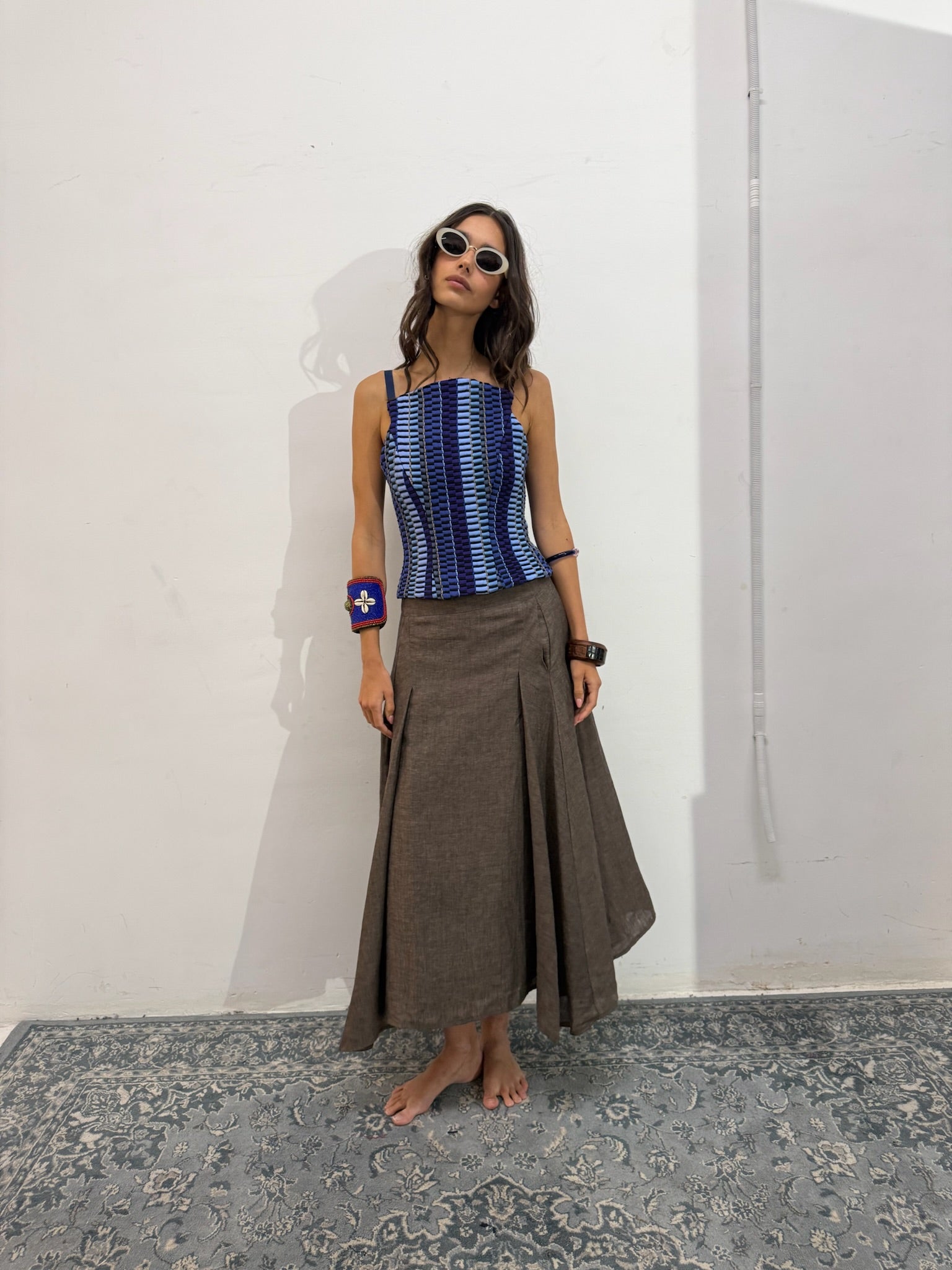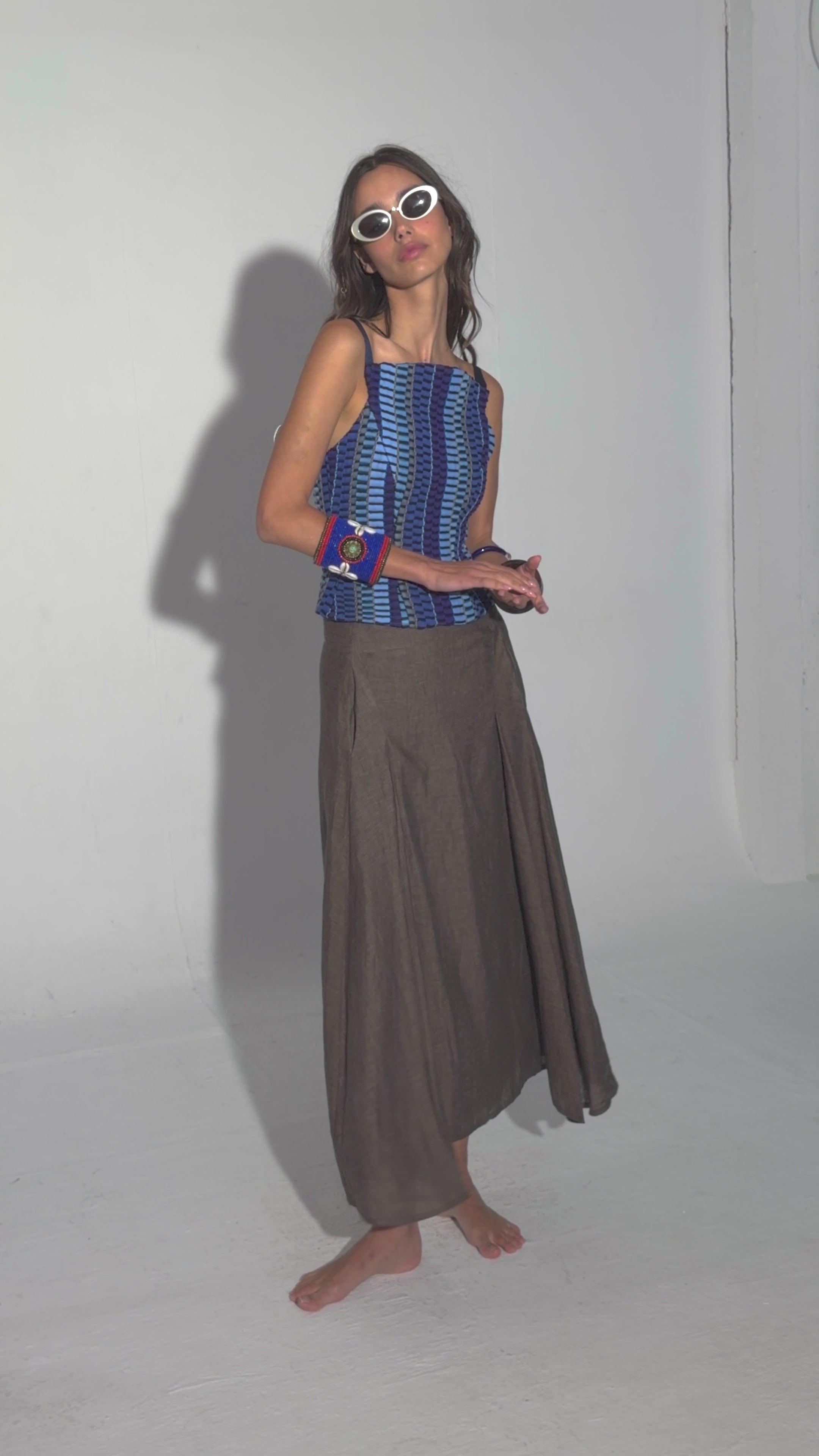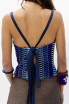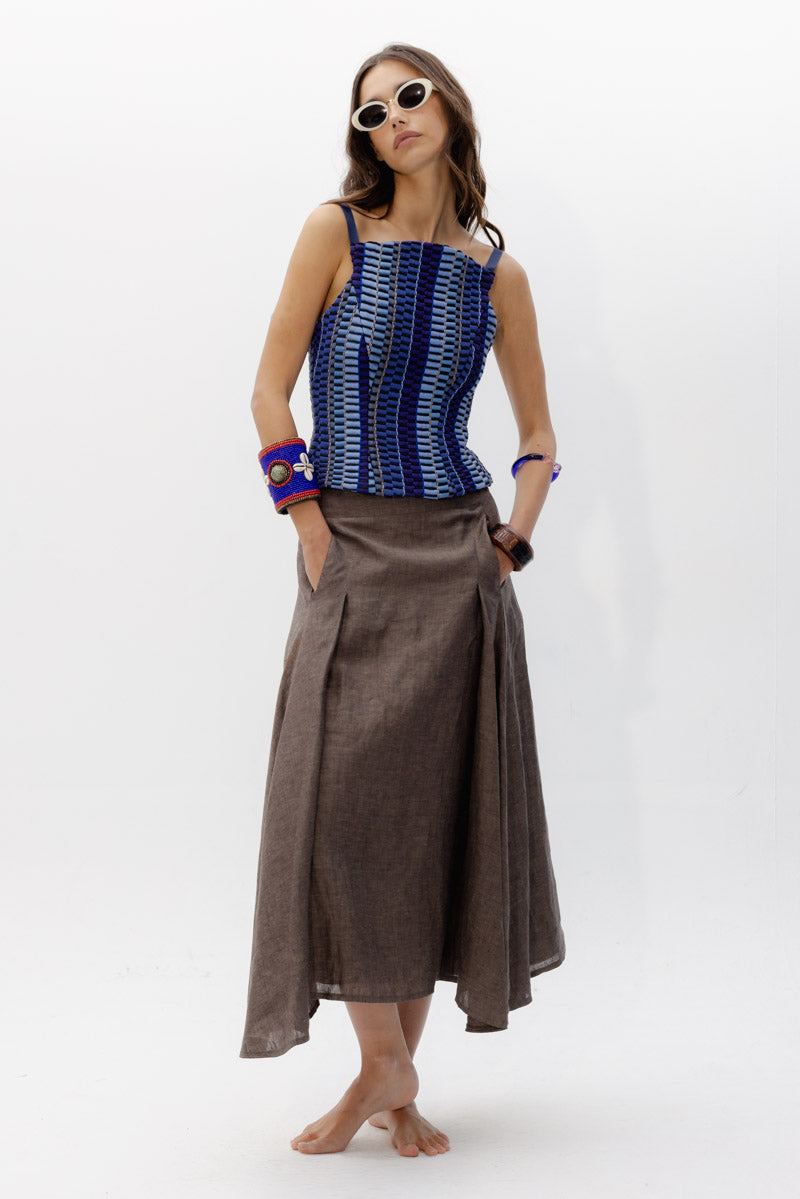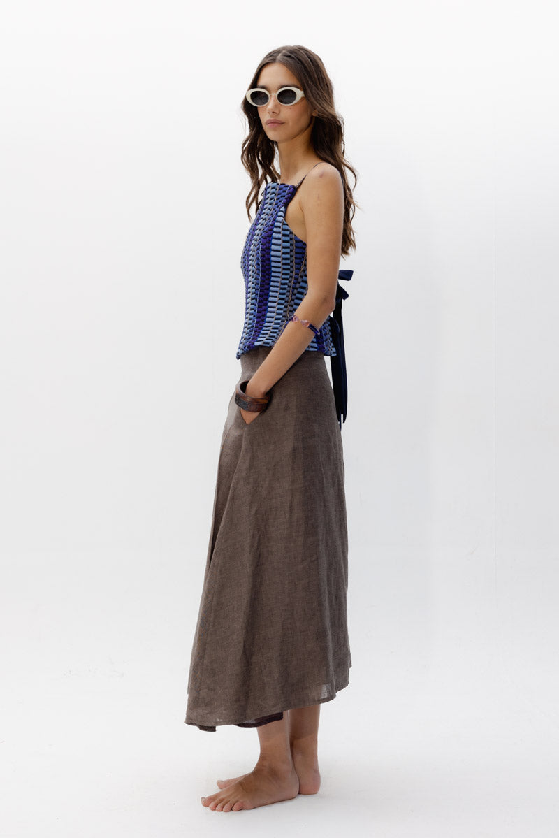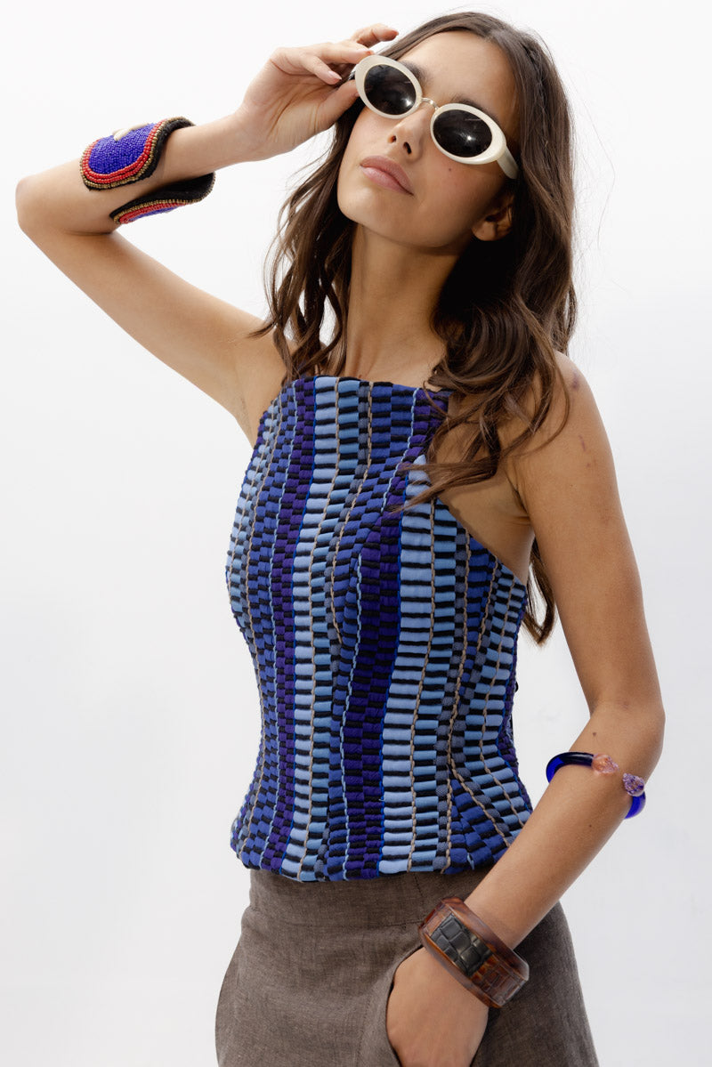 El Top Ipanema, una pieza diseñada con nuestro tejido hecho en telar en diferentes tonalidades de azules y texturas como lino, tul o seda ; jugando con las diferentes líneas y direcciones que genera este tejido único.