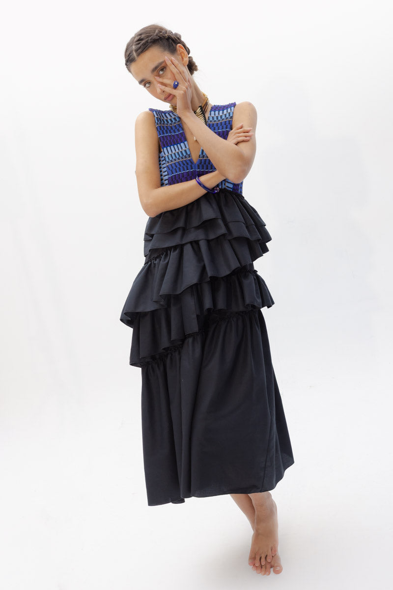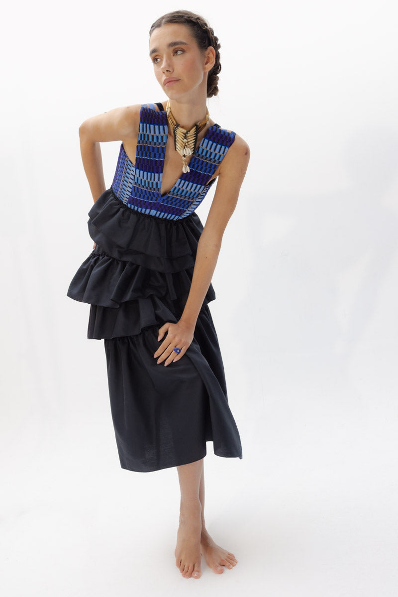 La parte inferior de esta pieza es un juego de volantes asimétricos que dan movimiento y personalidad a esta prenda.