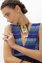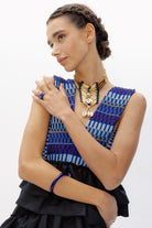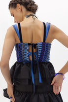 Su escote en V crea diferentes líneas y direcciones que genera este tejido único, acompañado de una espalda muy especial llena de diferentes cintas que hacen que se adapte y regule perfectamente al cuerpo.