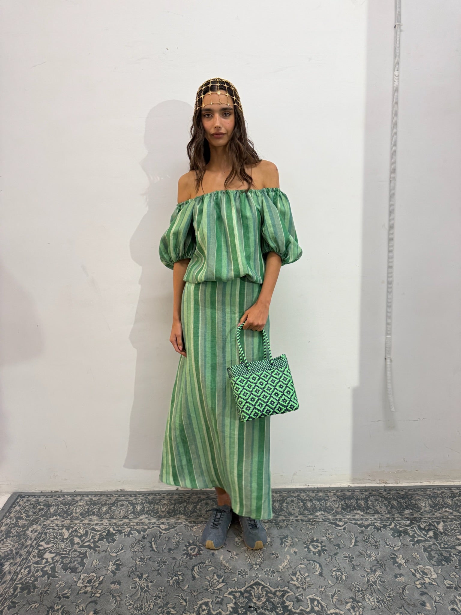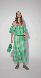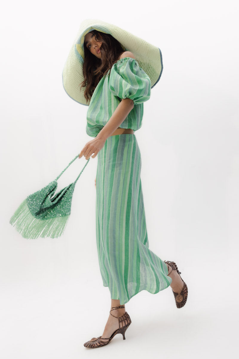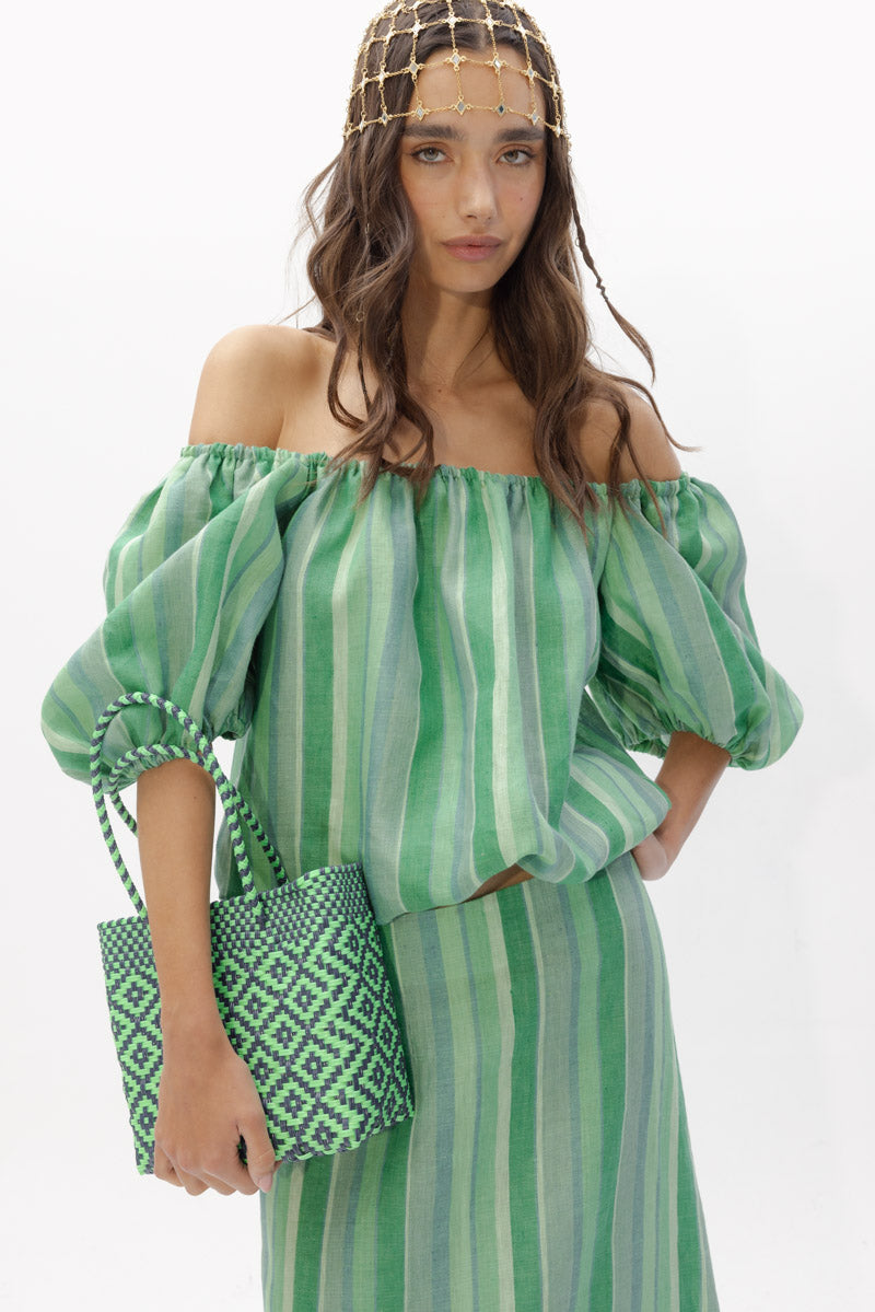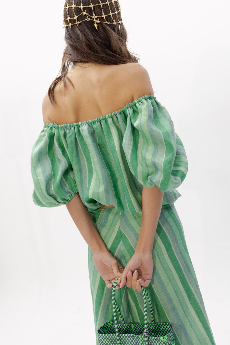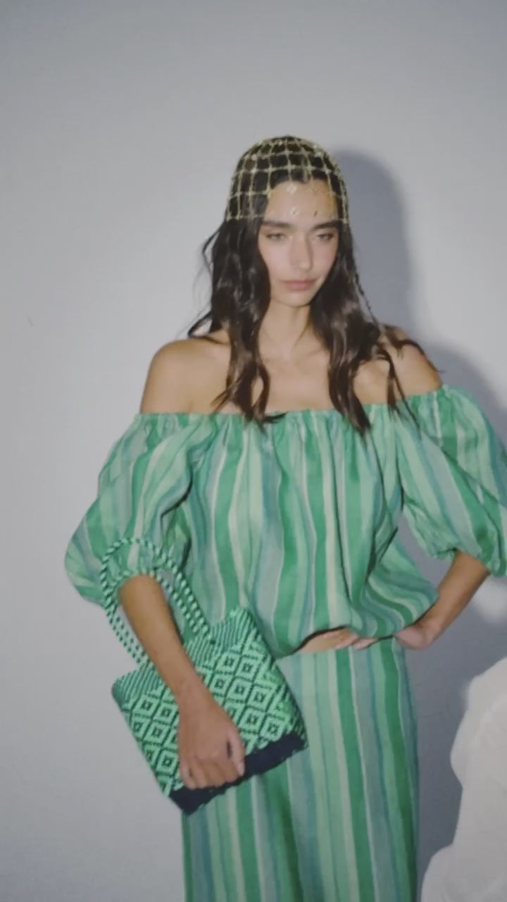 Nuestra blusa Vento , confeccionada en tejido de lino a rayas en tonos verdes y azulados.