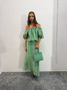 Para crear un total look muy versátil nos encanta acompañarlo con nuestra Falda Uma con su tejido a conjunto. Un look perfecto tanto para una ocasión especial con tacón y un sombrero divertido, como por separado para opciones más casual.
